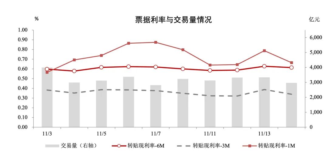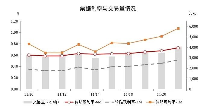 一級市場方面,市場上行本周市場承兌、于求貼現(xiàn)維持高位。票據(jù)票據(jù)本周日均承兌2037.97億元,利率較上周環(huán)比增長1.59%;本周日均貼現(xiàn)1798.27億元,加速交易較上周環(huán)比下降0.03%;承貼比88.24%,周報(bào)較上周環(huán)比減少1.43個(gè)百分點(diǎn)。市場上行11月票據(jù)市場到期量約2.74萬億元,于求補(bǔ)到期貼現(xiàn)日均需求約為1370億元。票據(jù)票據(jù)