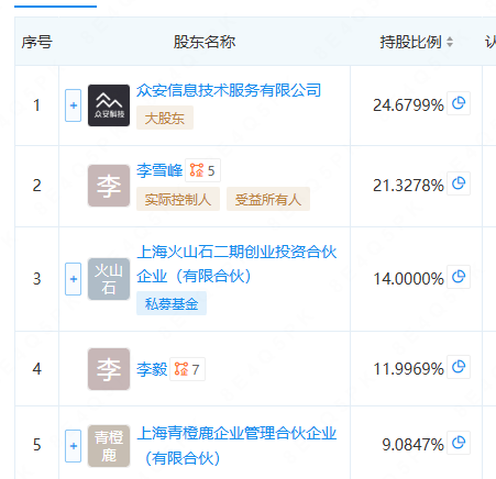 工商資料顯示,百保(上海)科技有限公司的股東結(jié)構(gòu)中,眾安信息技術(shù)服務(wù)有限公司持股24.68%,李雪峰持股21.33%,上海火山石二期創(chuàng)業(yè)投資合伙企業(yè)持股14.00%?;鹕绞顿Y是一家知名創(chuàng)投機(jī)構(gòu),成立于2016年5月,專注于泛智能技術(shù)和醫(yī)療健康領(lǐng)域的早期投資,管理規(guī)模超過(guò)30億元人民幣。這樣的股東背景曾為百保君增信不少。