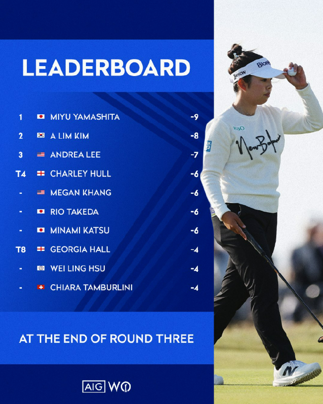 機(jī)會(huì)并非只屬于金阿林。山下美夢(mèng)有的掙扎讓決賽輪充滿(mǎn)變數(shù)。安德莉亞-李(Andrea Lee)交出67桿,落后2桿,排名第三位;隨后是赫爾、梅根-康(68桿)、竹田麗央(74桿)和勝南——她的65桿追平了賽事單輪最佳紀(jì)錄。