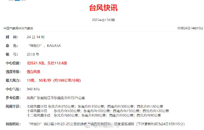 今天14 時,樺加“樺加沙”減弱為強臺風級,沙減中心附近最大風力為15級,強臺 50米/秒(約180公里/小時),風級中心位于距離廣東省陽江市東偏南方向約75公里的樺加海面上。
