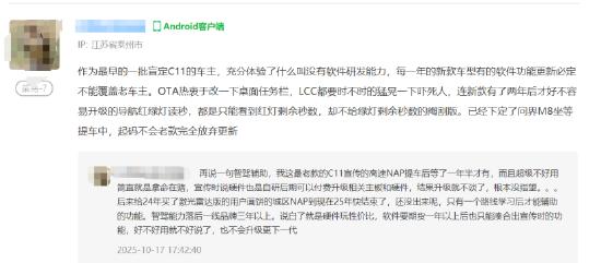 一位零跑車主吐槽稱,作為最早的一批盲定C11的車主,充分體驗了什么叫沒有軟件研發(fā)能力,每一年的新款車型有的軟件功能更新必定不能覆蓋老車主。