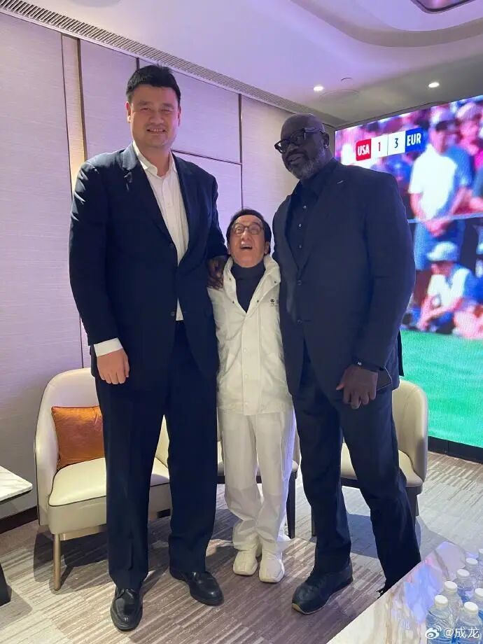 還有一張是成龍“夾”在姚明和奧尼爾中間,巨大的身高差,讓成龍忍不住仰著頭,露出驚訝的表情。