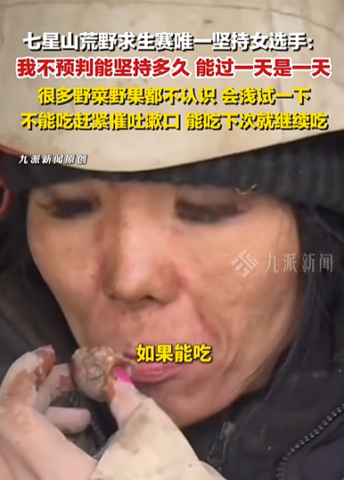 10月24日,九派新聞?dòng)浾咛皆L“冷美人”,她表示目前第16天,自己感覺狀態(tài)尚可。她稱,不預(yù)判自己能堅(jiān)持多久,能過一天是一天,“很多野菜野果都不認(rèn)識(shí),會(huì)淺試一下,不能吃趕緊催吐漱口,能吃下次就繼續(xù)吃。”