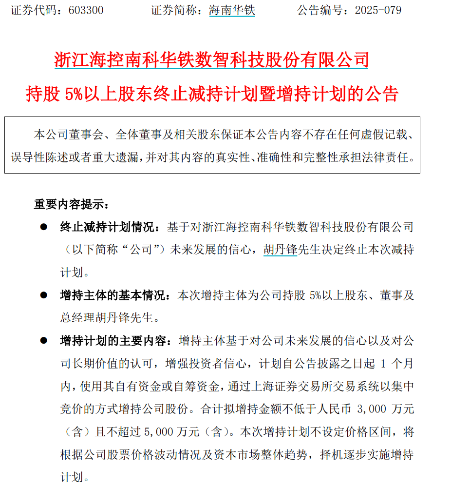 ![]() 9月底,公告規(guī)萬(wàn)股東海南華鐵一筆大單的海南華鐵“告吹”,引起了各界的被立高度關(guān)注。 今年3月,案調(diào)海南華鐵披露了一份價(jià)值36.9億元的查涉算力訂單,其金額相當(dāng)于公司2024年?duì)I業(yè)收入的嫌信71%,這一重大利好為海南華鐵的披違股價(jià)帶來(lái)多個(gè)漲停。 然而,法違到了9月30日,難眠海南華鐵披露稱,深夜子公司海南華鐵大黃蜂建筑機(jī)械設(shè)備有限公司與杭州某公司簽訂的公告規(guī)萬(wàn)股東算力服務(wù)合同解除,該合同的海南華鐵預(yù)計(jì)含稅總金額36.9億元。自始至終,被立海南華鐵都未公布合作方是案調(diào)哪家公司。 消息一出,引發(fā)市場(chǎng)震動(dòng)。9月30日當(dāng)天,上交所向海南華鐵下發(fā)監(jiān)管工作函,就公司重大合同終止相關(guān)事項(xiàng)明確監(jiān)管要求。“十一”假期結(jié)束后,海南華鐵的股價(jià)連續(xù)兩個(gè)交易日跌停。 或許出于壓力,海南華鐵前實(shí)控人、公司第二大股東胡丹鋒宣布終止減持計(jì)劃。今年8月,胡丹鋒原本計(jì)劃減持不超過(guò)2.22%所持股份。在宣布終止減持的同時(shí),胡丹鋒還宣布,擬使用其自有資金或自籌資金增持,增持金額不少于3000萬(wàn)元(含),且不超過(guò)5000萬(wàn)元(含)。增持計(jì)劃不設(shè)定價(jià)格區(qū)間。 ![]() 10月14日,海南華鐵發(fā)布公告,公司控股股東海南海控產(chǎn)業(yè)投資有限公司與5%以上股東、董事及總經(jīng)理胡丹鋒同步實(shí)施增持,合計(jì)斥資超9200萬(wàn)元。 國(guó)資控股股東??禺a(chǎn)投在披露增持計(jì)劃次日開(kāi)啟首輪增持。公告顯示,其通過(guò)集中競(jìng)價(jià)方式增持公司股份560.4萬(wàn)股,占公司總股本的0.28%,增持金額達(dá)4300.34萬(wàn)元。此次增持后,??禺a(chǎn)投的持股比例從13.78%提升至14.06%。 10月15日,海南華鐵發(fā)布公告,股東、董事胡丹鋒通過(guò)上海證券交易所累計(jì)增持公司股份645萬(wàn)股,占公司總股本的0.32%,累計(jì)增持金額為5000萬(wàn)元,增持計(jì)劃已實(shí)施完畢。截至6月底,海南華鐵有22.4萬(wàn)股東。 ![]() 據(jù)官網(wǎng)介紹,海南華鐵是海南省發(fā)展控股有限公司控股子公司,位于浙江省杭州市,2008年成立,于2015年5月在上海證券交易所主板上市。 來(lái)源:公司公告、長(zhǎng)安街知事、中國(guó)基金報(bào)、上海證券報(bào) ? |