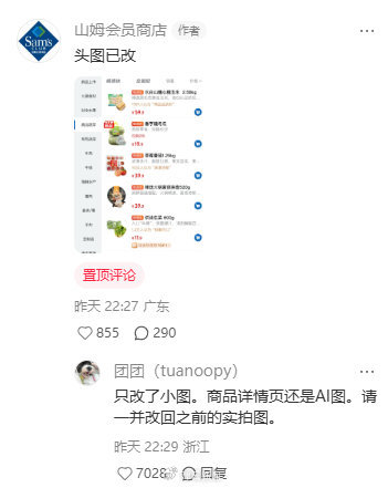 但部分網(wǎng)友似乎并不買賬,仍未停止對高管本人的投訴和抵制。聲明發(fā)布后約半小時(shí),山姆官方賬號在評論區(qū)置頂回復(fù),稱“頭圖已改”,并附上APP內(nèi)截圖,顯示產(chǎn)品圖已改回會員要求的“白底原圖”。但仍有網(wǎng)友回復(fù),“只改了小圖。商品詳情頁還是AI圖。請一并改回之前的實(shí)拍圖?!?/p>