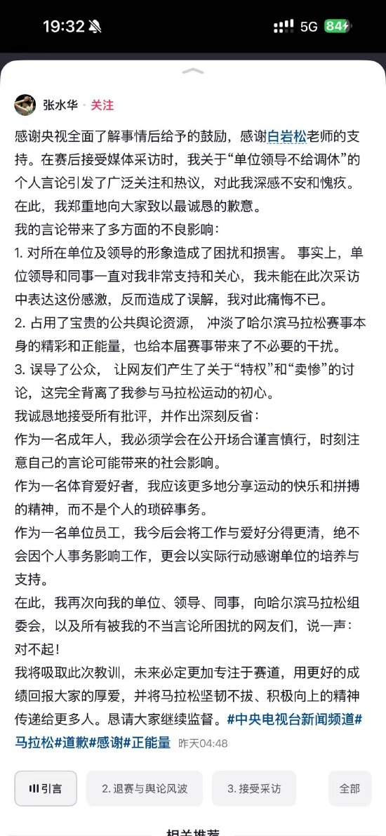 “最快女護士”張水華發(fā)文道歉:對單位及領導形象造成困擾和損害痛悔不已,今后會將工作與愛好分得更清,絕不會因個人事務影響工作 。此前報道:最快女護士張水華回應調班爭議:哭是一種情緒釋放,并非施壓領導責任