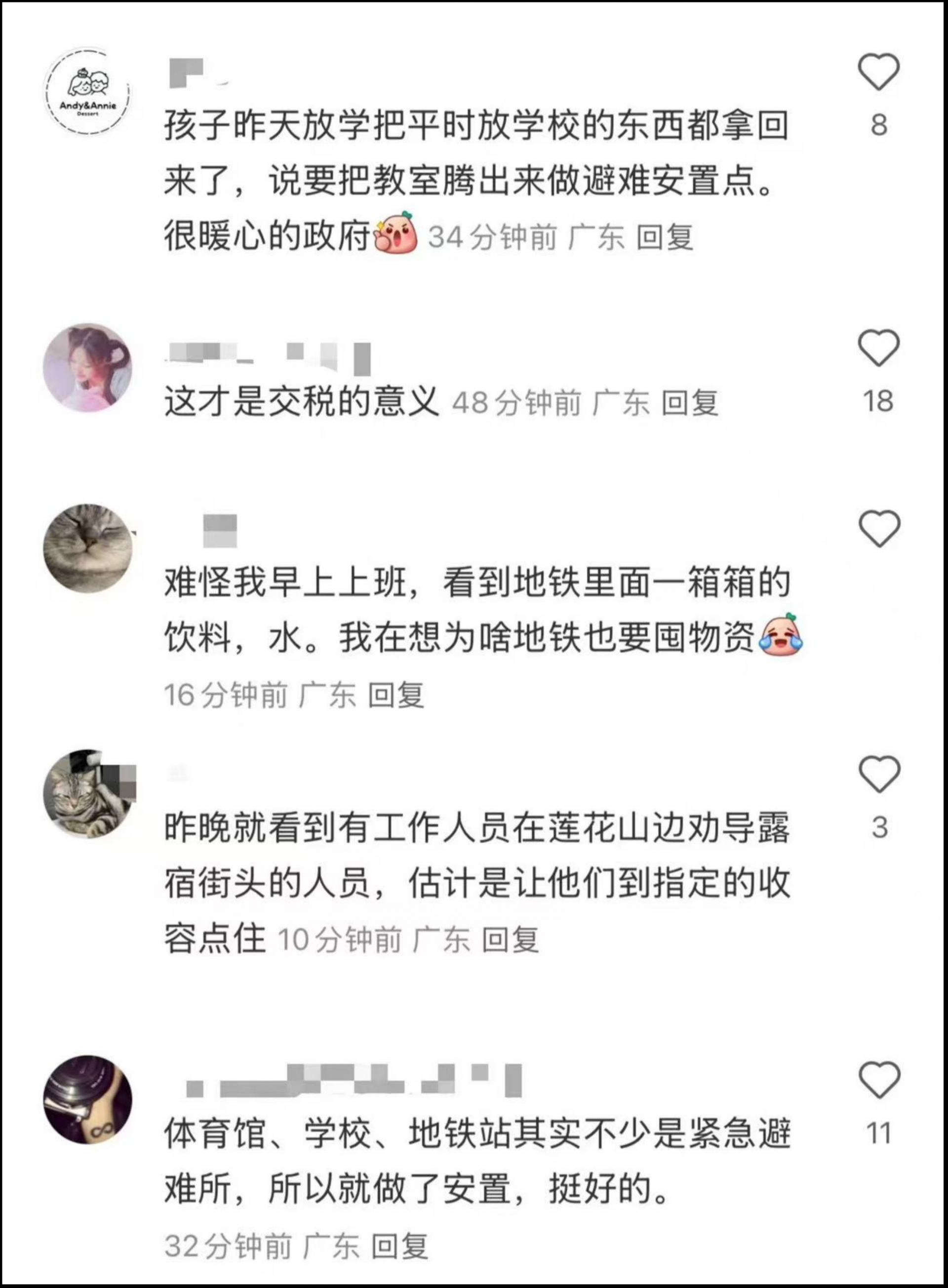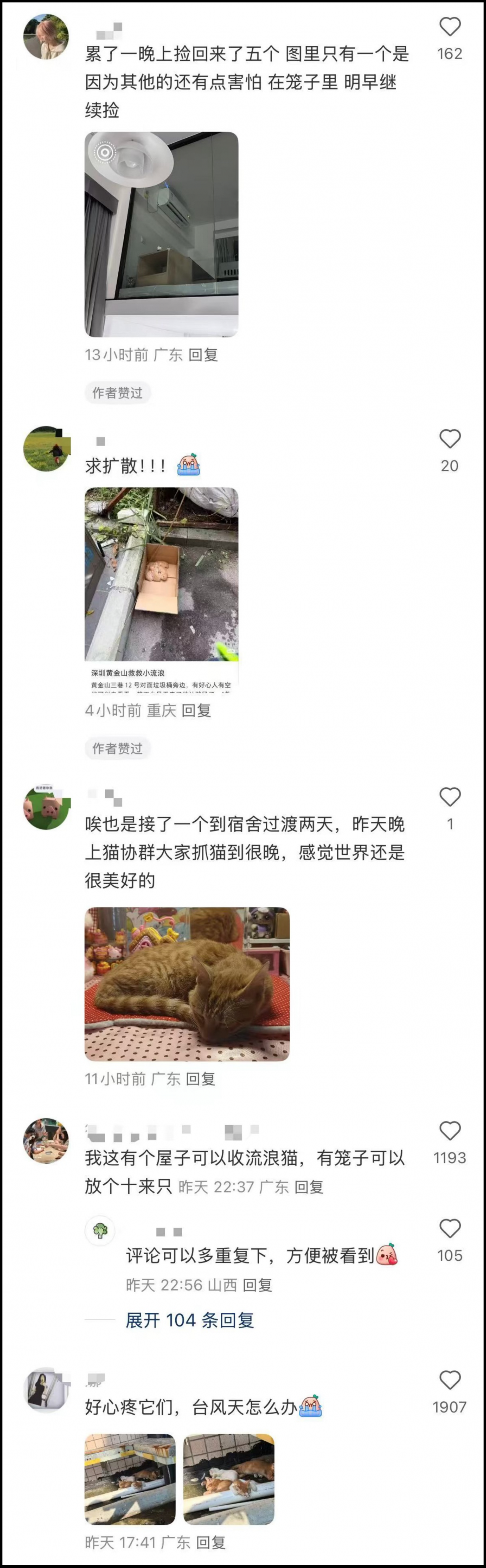 有人組隊(duì)“抓貓”到很晚,把無(wú)家可歸的小動(dòng)物接回宿舍收養(yǎng)幾天,還有人在評(píng)論區(qū)提醒大家如果發(fā)現(xiàn)流浪動(dòng)物,盡可能地給它們一些水和食物,號(hào)召所有商戶店家、小區(qū)建筑不要驅(qū)趕,讓他們也能躲避狂風(fēng)暴雨。
