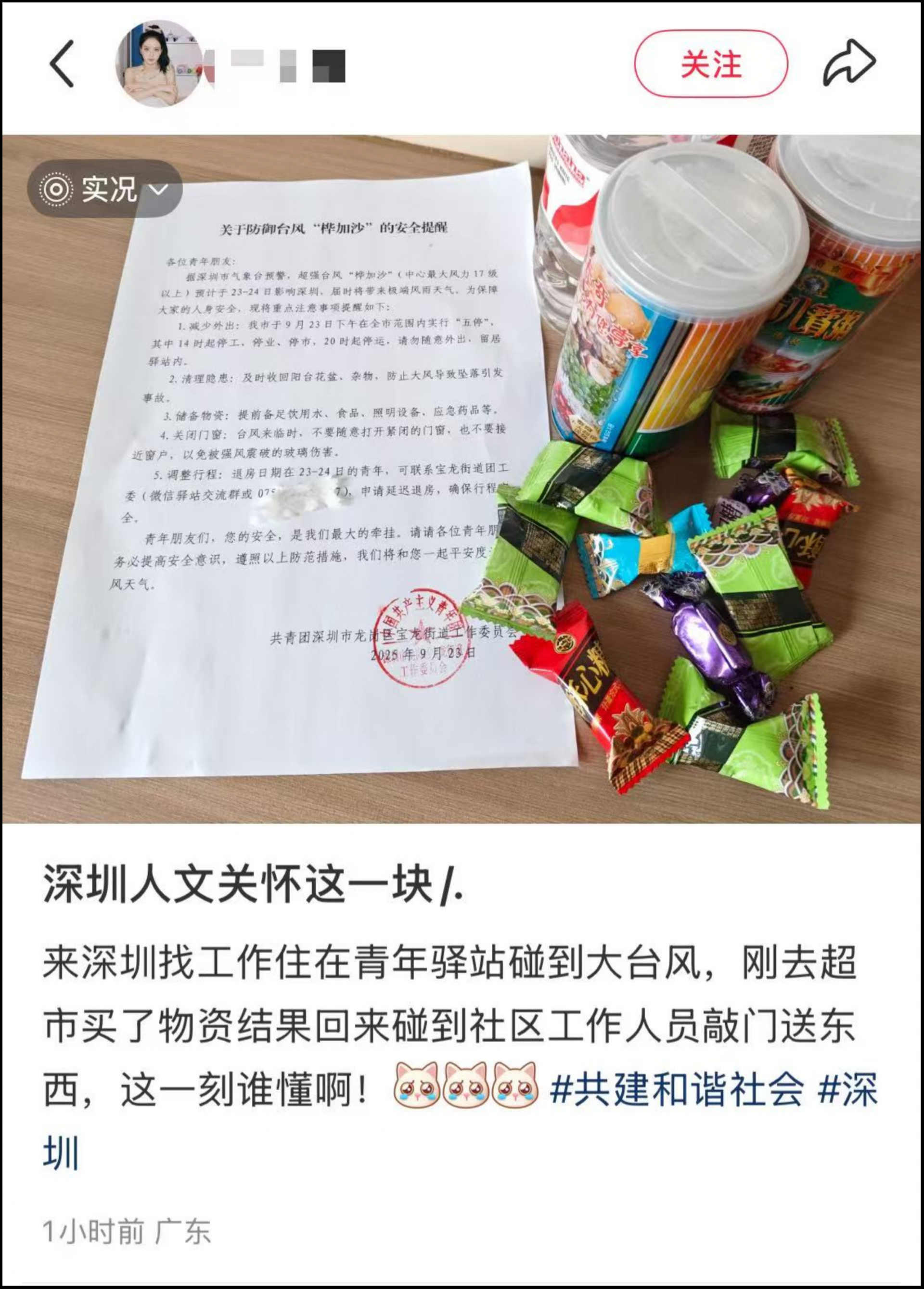 “來(lái)深圳找工作,住在青年驛站,碰到大臺(tái)風(fēng)。剛?cè)コ匈I(mǎi)物資,回來(lái)碰到社區(qū)工作人員敲門(mén)送東西。這一刻誰(shuí)懂?。 ?月23日中午,來(lái)深求職的網(wǎng)友在社交媒體發(fā)布的帖文,說(shuō)透了防御臺(tái)風(fēng)之際深圳的“暖”。