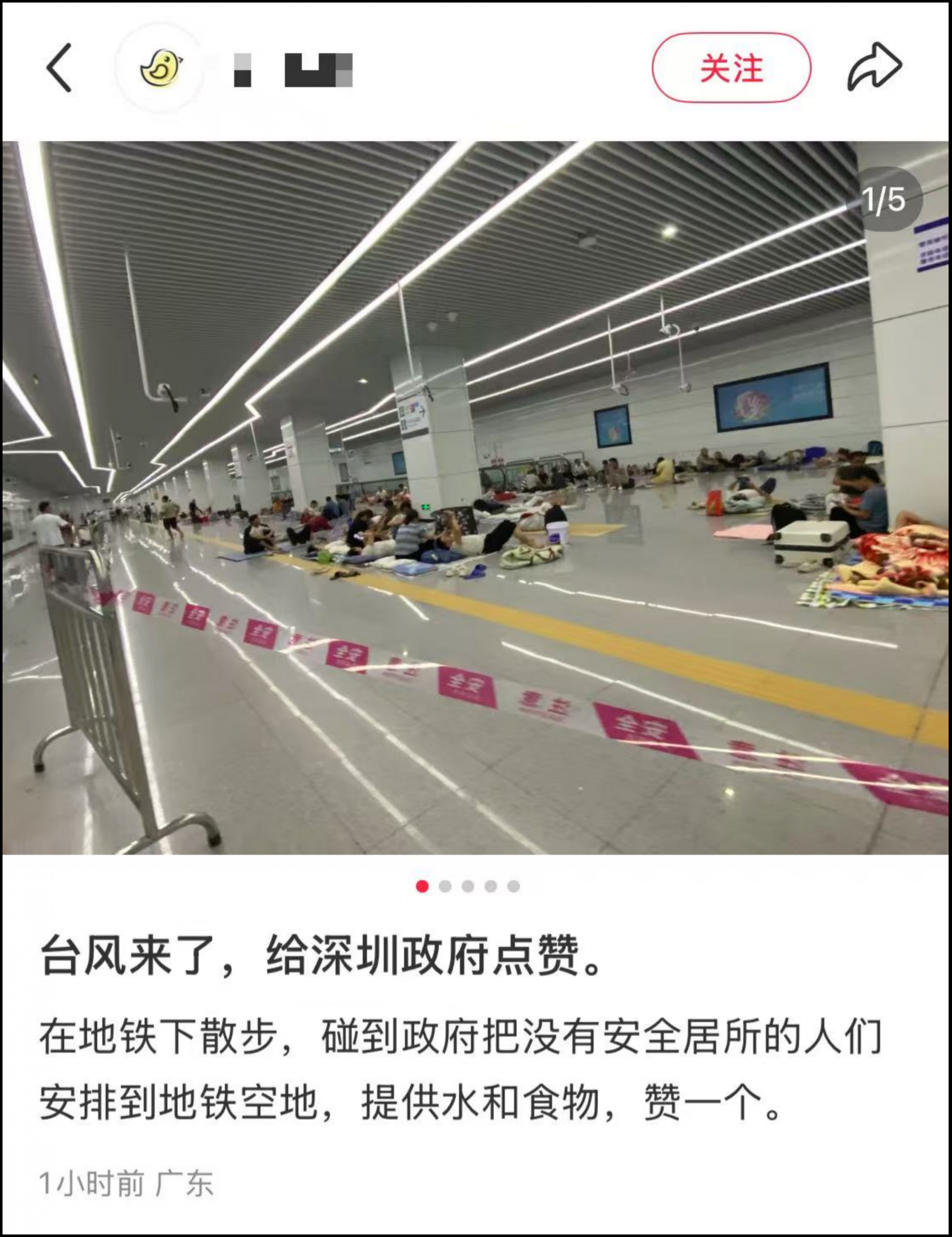 9月23日,網(wǎng)友第18號(hào)臺(tái)風(fēng)“樺加沙”(超強(qiáng)臺(tái)風(fēng)級(jí))已進(jìn)入深圳500公里范圍。直呼住當(dāng)天中午,樺加沙有網(wǎng)友在社交平臺(tái)發(fā)帖稱“臺(tái)風(fēng)來(lái)了,臺(tái)風(fēng)給深圳政府點(diǎn)贊”。臨前網(wǎng)友說(shuō)看到地鐵已經(jīng)圍出一片區(qū)域,深圳為群眾提供緊急避難場(chǎng)所,幕讓現(xiàn)場(chǎng)還提供了飲用水和食物。網(wǎng)友