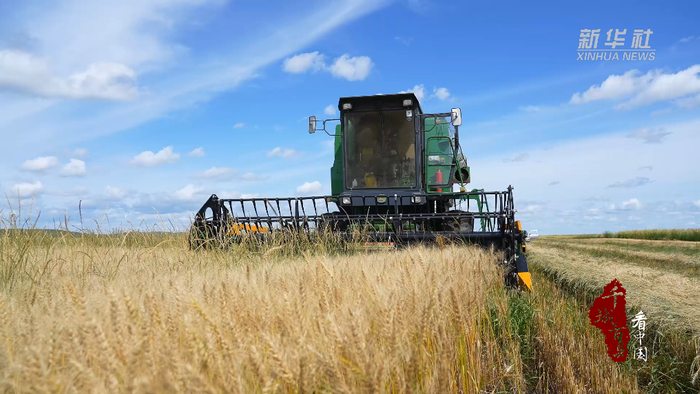 在錫林浩特市白音錫勒牧場(chǎng)麥田收割現(xiàn)場(chǎng)。