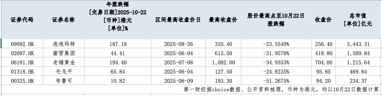 此外,這些股票前期漲幅巨大,本身也積累了顯著的獲利了結(jié)壓力。Choice數(shù)據(jù)顯示,泡泡瑪特、老鋪黃金、蜜雪集團(tuán)年內(nèi)最大漲幅分別達(dá)310%、309%和112%。即便經(jīng)歷近期回調(diào),截至10月22日,三者年內(nèi)漲幅仍分別高達(dá)187%、194%和44%,部分投資者選擇鎖定收益,集中賣出進(jìn)一步加劇了股價(jià)壓力。