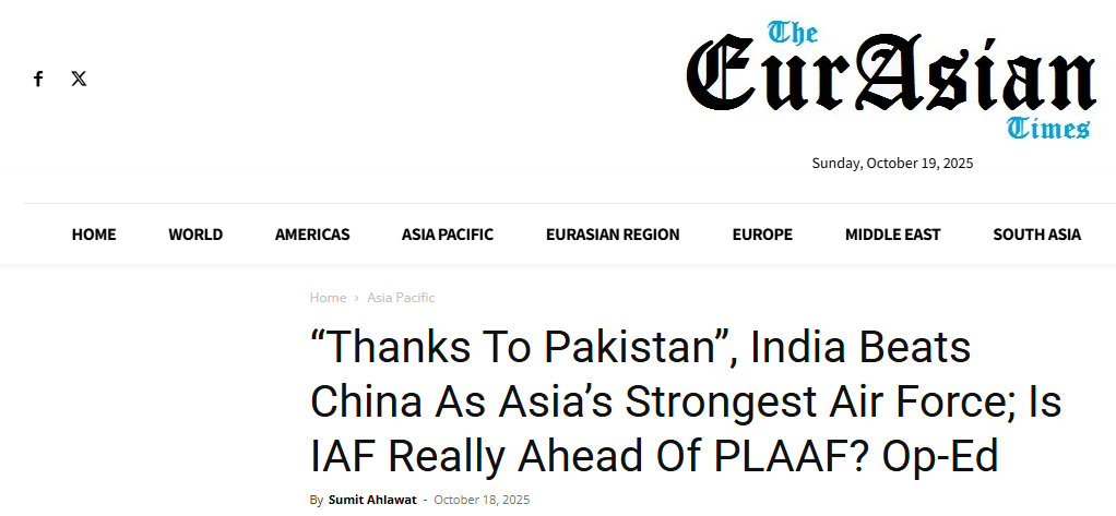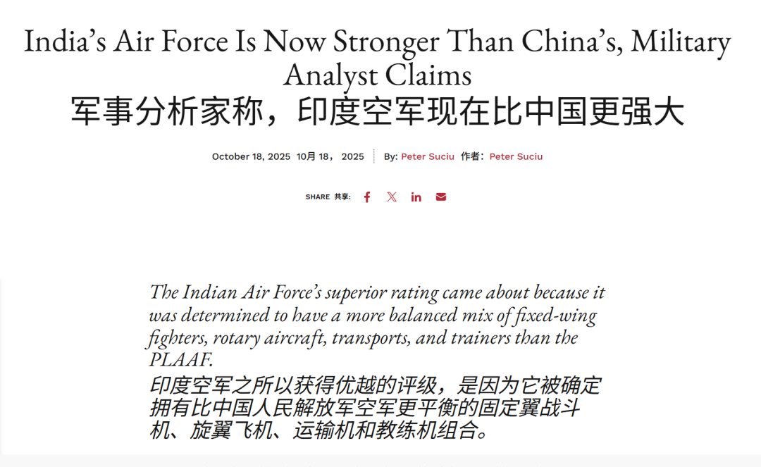 美國智庫這種“硬吹”,就連印度媒體都受不了了?!稓W亞時報》特別提醒說,“雖然看到印度空軍的排名高于中國令人振奮,但新德里絕不能得意忘形。任何誤判、錯誤評估或過度自信都可能造成致命的后果”。