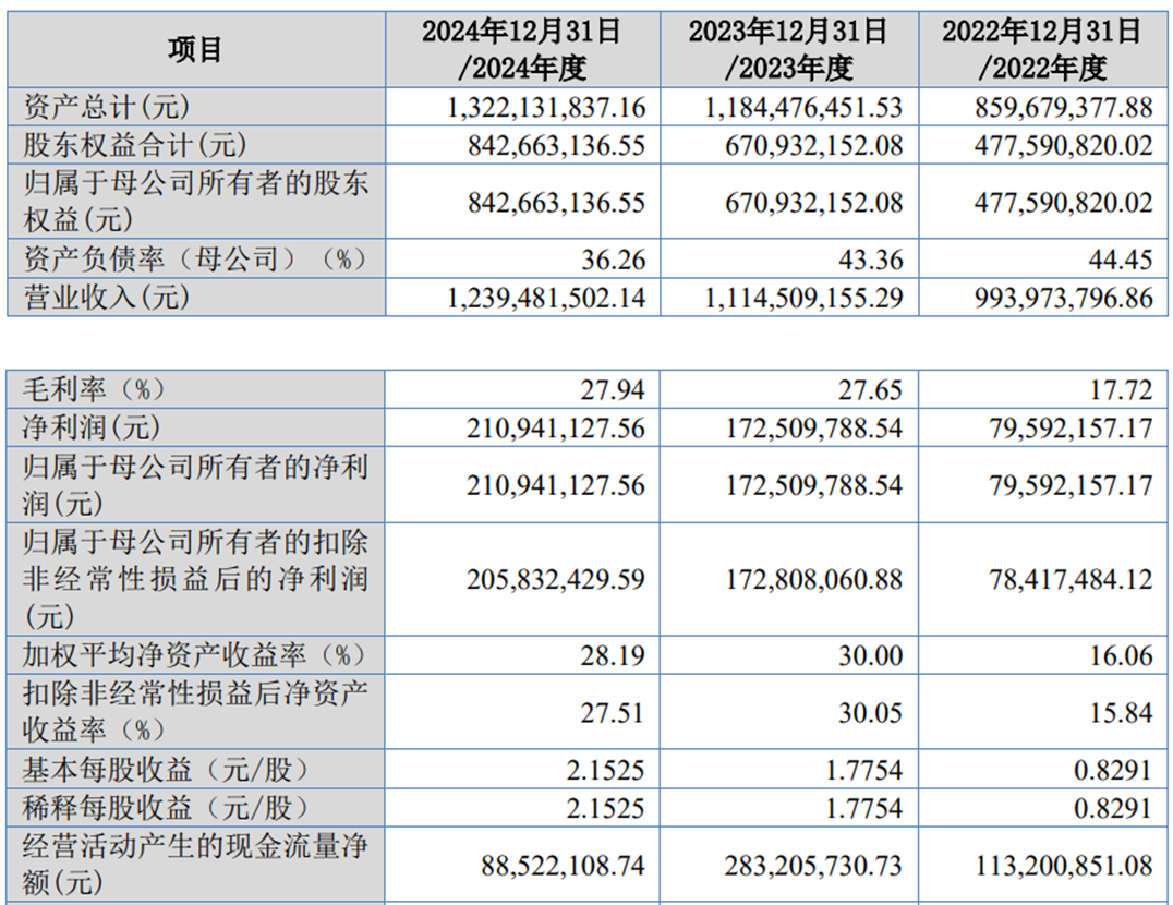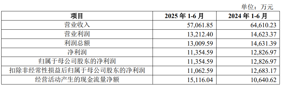 2025年1-6月,公司營業(yè)收入為57,061.85萬元,較上年同期下降11.68%;凈利潤/歸屬于母公司股東的凈利潤為11,354.59萬元,較上年同期下降11.48%;扣除非經(jīng)常性損益后歸屬于母公司股東的凈利潤為11,062.59萬元,較上年同期下降12.78%;經(jīng)營活動產(chǎn)生的現(xiàn)金流量凈額為15,116.04萬元,較上年同期增長42.06%。