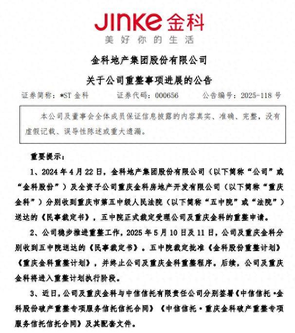金科股份表示,房地2025年5月10日及11日,產(chǎn)業(yè)公司及重慶金科分別收到五中院送達(dá)的債主中信最大重整《民事裁定書》。五中院裁定批準(zhǔn)《金科股份重整計(jì)劃》《重慶金科重整計(jì)劃》,家債并終止公司及重慶金科重整程序。信托后續(xù),簽下金科股份及重慶金科將進(jìn)入重整計(jì)劃執(zhí)行階段。房地