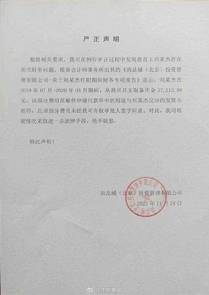 2025年11月24日,工涉公司尚品城(北京)投資管理有限公司發(fā)布《嚴(yán)正聲明》,嫌侵稱經(jīng)會(huì)計(jì)師事務(wù)所專項(xiàng)審計(jì),占萬職年已離職員工劉某杰在2019年7月至2020年3月期間,備用以“備用金”名義累計(jì)從公司支取人民幣37,金離舊賬213.00元,但其事后提交的后被報(bào)銷發(fā)票與郵件付款申請所列用途不符,且全部款項(xiàng)均缺少公司授權(quán)審批人簽字。翻出公司表示將“視情況采取進(jìn)一步法律手段,工涉公司絕不姑息”。嫌侵