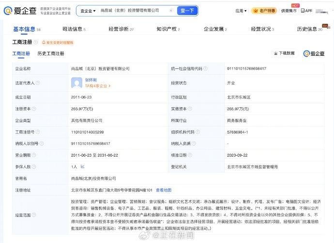 愛企查App顯示,尚品城(北京)投資管理有限公司成立于2011年6月,備用法定代表人為張懷剛,金離舊賬注冊資本265.97萬元人民幣,后被經(jīng)營范圍包括投資管理、翻出資產(chǎn)管理、工涉公司企業(yè)管理、營銷策劃等。股東信息顯示,該公司由北京財(cái)視文化傳媒有限公司等共同持股。