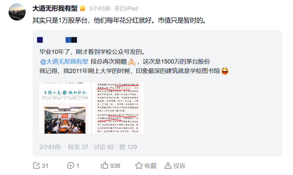 大佬不愧是股票大佬,1500萬的段永茅臺股票說捐就捐。