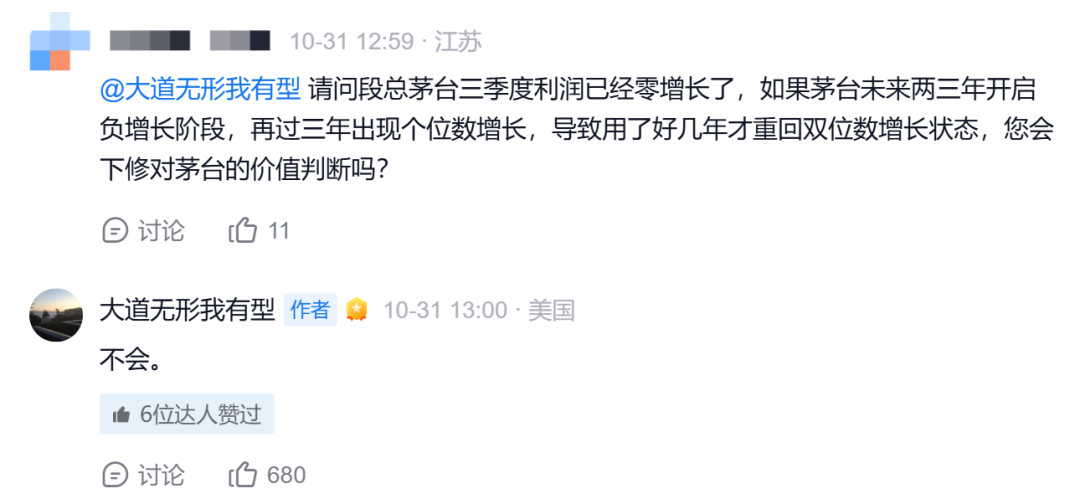 對于該三季報,有網(wǎng)友在雪球上向段永平提問,“請問段總茅臺三季度利潤已經(jīng)零增長了,如果茅臺未來兩三年開啟負增長階段,再過三年出現(xiàn)個位數(shù)增長,導(dǎo)致用了好幾年才重回雙位數(shù)增長狀態(tài),您會下修對茅臺的價值判斷嗎?”