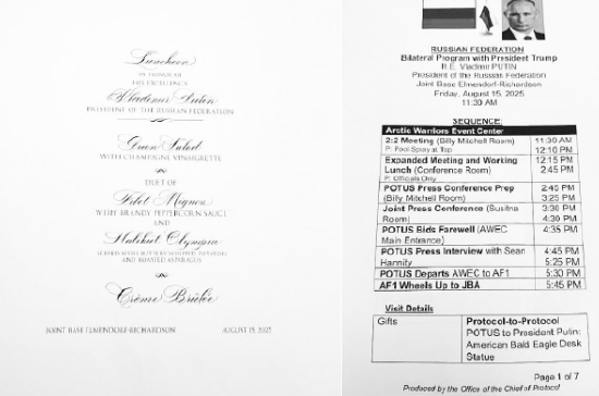 NPR的普特會報(bào)道提到,15日上午,白宮安克雷奇市一家酒店的文件打印機(jī)上被發(fā)現(xiàn)留有8頁帶有美國國務(wù)院標(biāo)識的機(jī)密文件,其披露了當(dāng)天特朗普與普京會晤未公開的敏感細(xì)節(jié)。這些疑似美方人員意外遺留的文件,詳細(xì)記錄了峰會參與者、時(shí)間、地點(diǎn)(精確到會議室名稱)、美國政府雇員聯(lián)絡(luò)方式以及午宴機(jī)密安排等。文件為俄方人員標(biāo)注發(fā)音指南,例如普京總統(tǒng)標(biāo)注為“POO-tihn”。此外,其還透露特朗普計(jì)劃向普京贈送“美國白頭鷹桌飾雕像”。