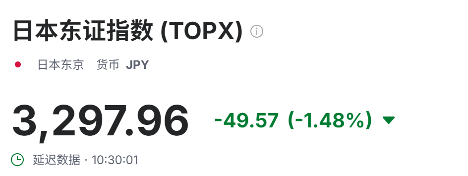 日本東證指數(shù)快速跳水,日本跌近1.5%,股市現(xiàn)報(bào)3297.96點(diǎn)。大跳跌超點(diǎn)高