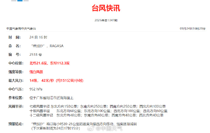 [樺加沙減弱至強臺風(fēng)級下限]“樺加沙”強度再度減弱,樺加沙16時中心附近最大風(fēng)力為14級( 42米/秒)是減弱級下強臺風(fēng)級的下限。