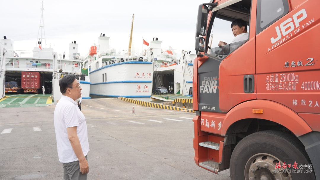 在新海港調(diào)度指揮中心,馮飛聽取有關(guān)部門和單位關(guān)于瓊州海峽航線復(fù)航、新能源汽車過海保障、高峰期運(yùn)力保障等情況匯報(bào)。