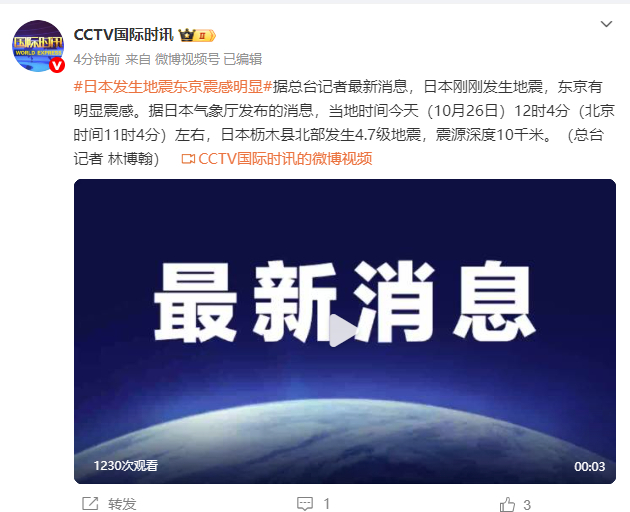 日本剛剛發(fā)生地震,日本東京有明顯震感。發(fā)生據(jù)日本氣象廳發(fā)布的地震東京消息,當(dāng)?shù)貢r(shí)間今天(10月26日)12時(shí)4分(北京時(shí)間11時(shí)4分)左右,震感日本櫪木縣北部發(fā)生4.7級地震,明顯震源深度10千米。日本(CCTV國際時(shí)訊)