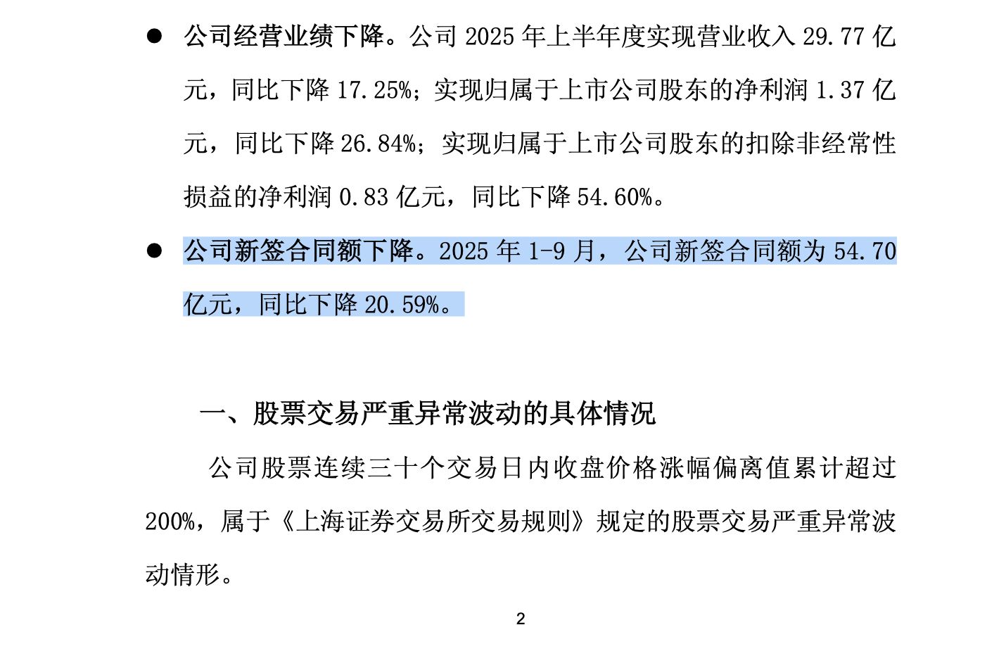 華建集團表示,目前公司主營業(yè)務未發(fā)生重大變化。公司2025年上半年度實現(xiàn)營業(yè)收入29.77億元,同比下降17.25%;實現(xiàn)歸屬凈利潤1.37億元,同比下降26.84%;實現(xiàn)扣非凈利潤0.83億元,同比下降54.6%。公司新簽合同額下降。2025年1月至9月,公司新簽合同額為54.7億元,同比下降20.59%。