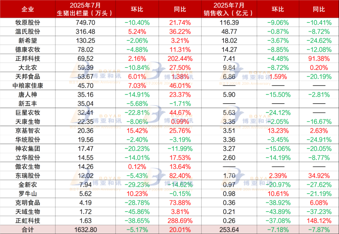 其中,仔豬23家豬企中,減速16家環(huán)比均出現(xiàn)下降,集體家上降超價格加速僅7家生豬出欄量環(huán)比增長。市豬牧原股份環(huán)比下降10.4%,出欄降至3月份以來單月最低銷量;新希望環(huán)比下降2.06%。下降下跌20家上市豬企(不含中糧家佳康、牧原新五豐、股份丨月巨星農(nóng)牧、傲農(nóng)生物)7月生豬銷售收入253.64億元,環(huán)比下降7.18%,同比下降7.87%。
