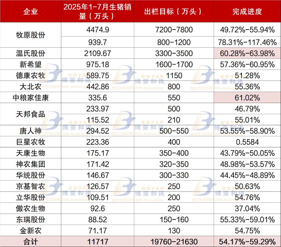 博亞和訊統(tǒng)計了17家上市企業(yè)1-7月共出欄生豬約11717萬頭,按年度最低出欄目標來看,1-7月完成度接近60%。其中,溫氏股份、中糧家佳康完成度已超60%,新希望、大北農(nóng)、巨星農(nóng)牧、東瑞股份等企業(yè)完成度在55%-60%之間……