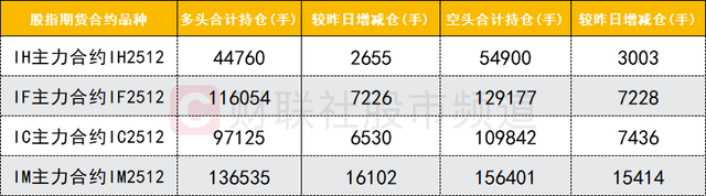 四大期指主力合約中,IH、IF、IC、IM合約多空雙方均加倉,IM合約多頭加倉數(shù)量較多。