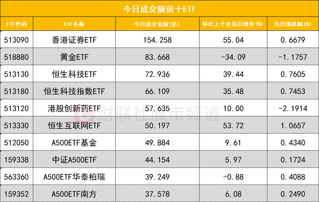 從成交額前十的ETF來看,香港證券ETF(513090)成交額位居首位,黃金ETF(518880)成交額位居次席。