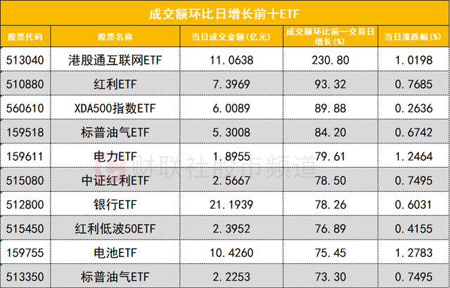 從成交額環(huán)比增長前十的ETF來看,港股通互聯(lián)網(wǎng)ETF(513040)成交額環(huán)比增長230%位居首位;紅利ETF(510880)成交額環(huán)比增長93%位居次席。