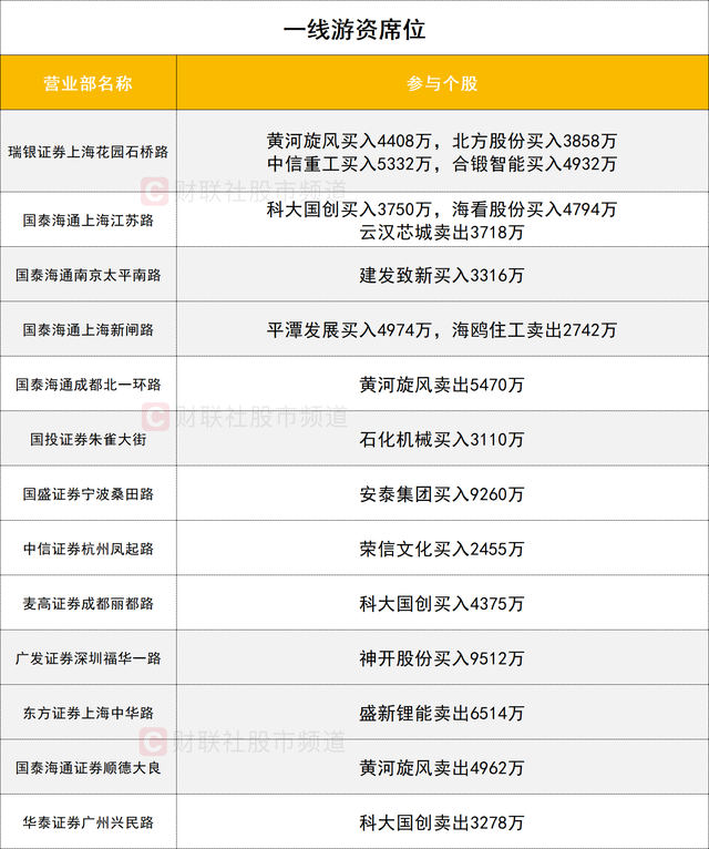一線游資活躍度較高,科大國創(chuàng)獲一線游資席位(國泰海通證券上海江蘇路)買入3750萬,同時獲另一家一線游資席位買入4375萬,但遭一線游資席位(華泰證券廣州興民路)賣出3278萬。黃河旋風(fēng)遭兩家一線游資席位(國泰海通證券順德大良和國泰海通證券成都北一環(huán)路)合計賣出1.04億。