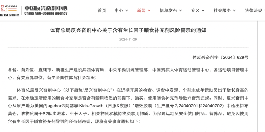中國國家體育總局反興奮劑中心于去年11月29日發(fā)布了一份編號為“體反興奮劑字〔2024〕629號”的后美風險提示通知。