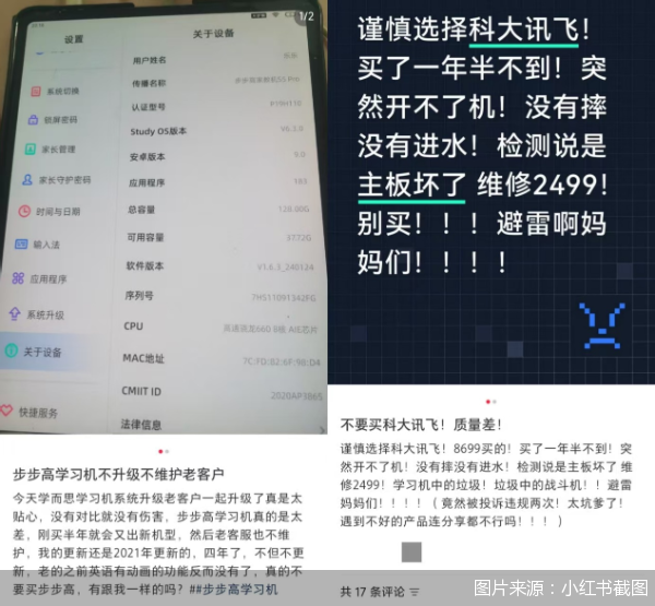 還有消費(fèi)者發(fā)帖吐槽,“買的小度學(xué)習(xí)機(jī),用不到半年就出現(xiàn)閃屏故障,寄去維修后,拿回來不到半年又出現(xiàn)同樣的問題”“購買的科大訊飛學(xué)習(xí)機(jī)使用不到二十天頻繁出現(xiàn)死機(jī)的情況”“聽力熊剛買兩周就死機(jī)無法進(jìn)入系統(tǒng)”……因?qū)W習(xí)硬件產(chǎn)品質(zhì)量問題而被消費(fèi)者吐槽、投訴的案例并不在少數(shù)。