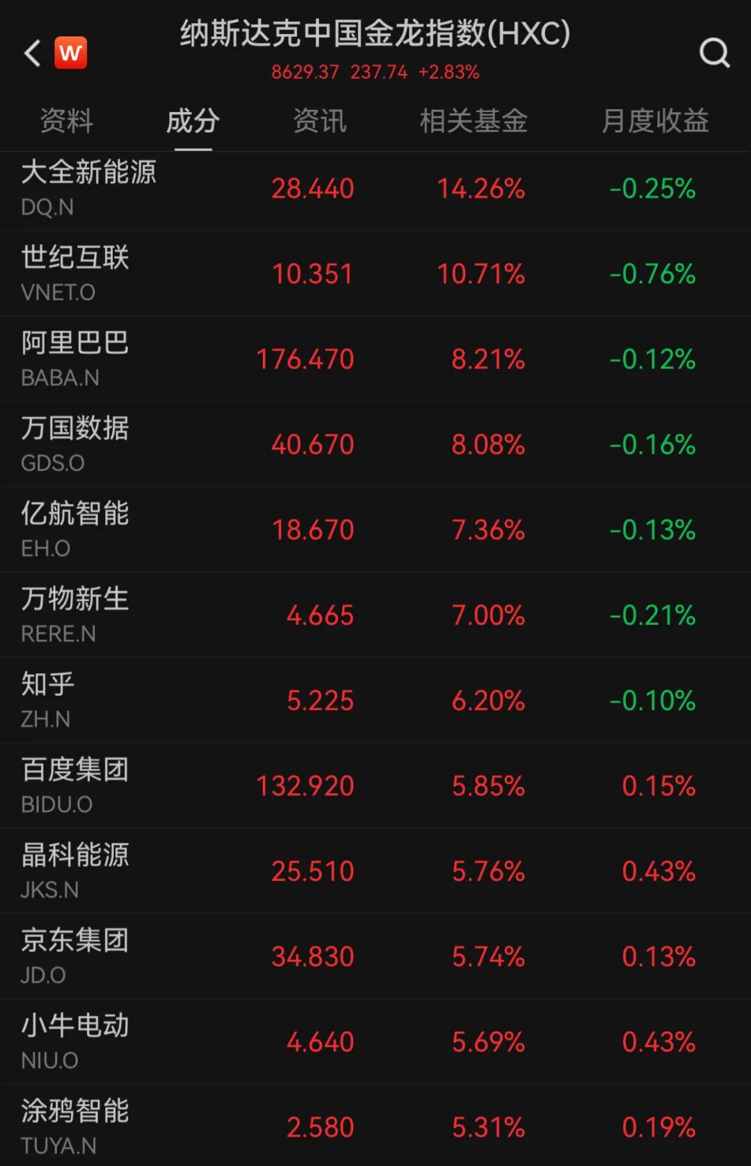 中國資產(chǎn)大漲。中國資產(chǎn)Wind數(shù)據(jù)顯示,大漲截至收盤,美國納斯達(dá)克中國金龍指數(shù)大漲2.83%。公告關(guān)稅其中,征收大全新能源大漲14.26%,歐盟世紀(jì)互聯(lián)漲超10%,汽車阿里巴巴、中國資產(chǎn)萬國數(shù)據(jù)漲超8%,大漲億航智能、美國萬物新生漲超7%,公告關(guān)稅知乎、征收百度集團(tuán)、歐盟京東集團(tuán)等跟漲。汽車