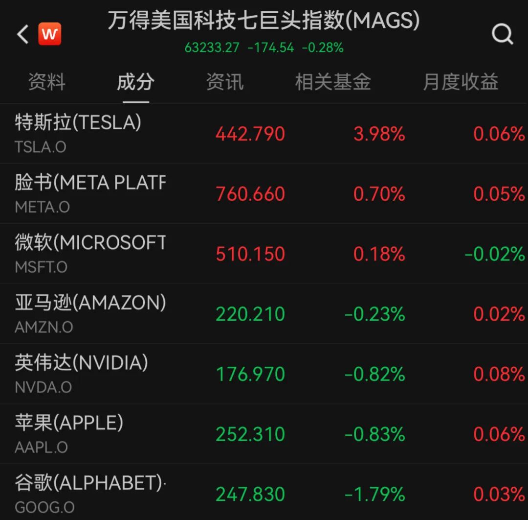美股科技七巨頭漲跌不一。中國資產(chǎn)Wind數(shù)據(jù)顯示,截至收盤,萬得美國科技七巨頭指數(shù)下跌0.28%。其中,特斯拉上漲近4%,臉書、微軟均小幅上漲;谷歌下跌1.79%,亞馬遜、英偉達(dá)、蘋果小幅下跌。