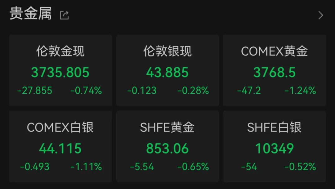 貴金屬方面,Wind數(shù)據(jù)顯示,截至當(dāng)?shù)貢r(shí)間9月24日收盤,現(xiàn)貨黃金價(jià)格下跌0.74%,報(bào)3735.805美元/盎司;COMEX黃金期貨下跌1.24%,報(bào)3768.5美元/盎司。