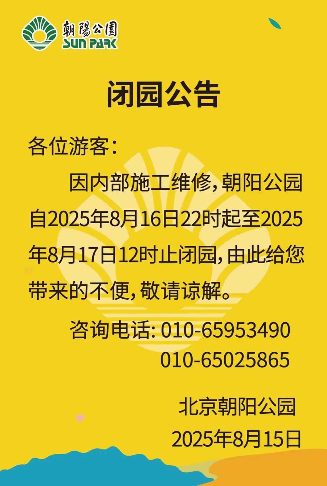 新京報訊 據(jù)北京朝陽公園8月15日消息,別跑空因內(nèi)部施工維修,北京朝陽公園自2025年8月16日22時起至2025年8月17日12時止閉園。朝陽