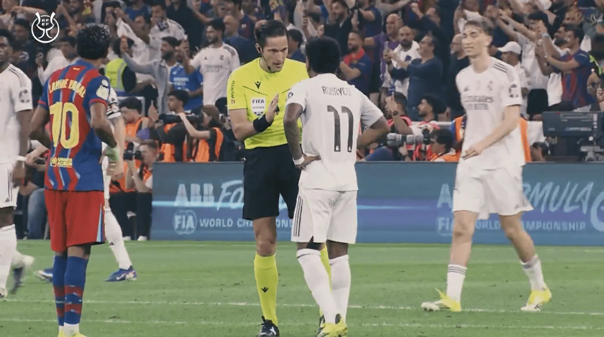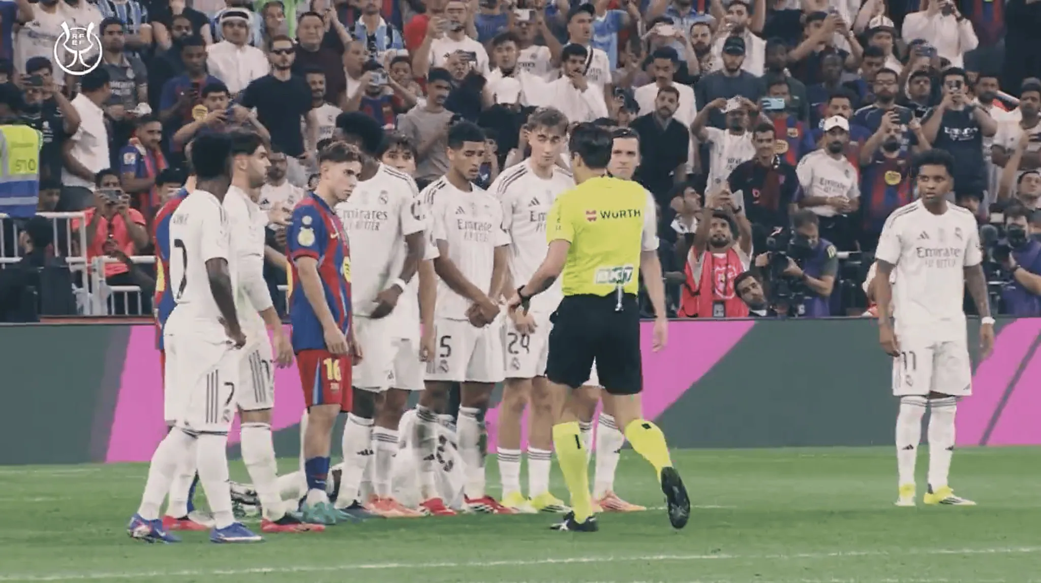 巴薩獲得禁區(qū)前任意球時,費爾明站在皇馬人墻附近。穆努埃拉走近提醒他:“排好人墻。注意距離。費爾明,如果進(jìn)球了,而你還站在這里,我會因為間接任意球干擾把進(jìn)球吹掉,明白嗎?”費爾明隨后不滿地離開該位置。