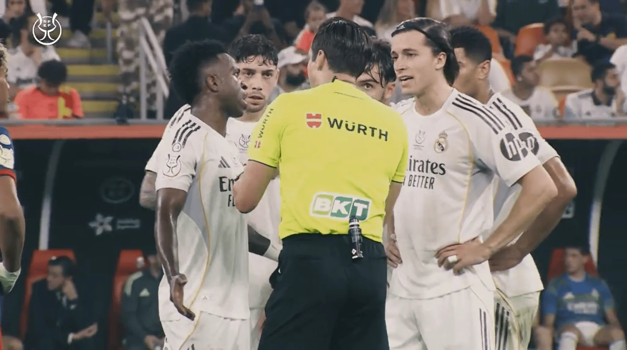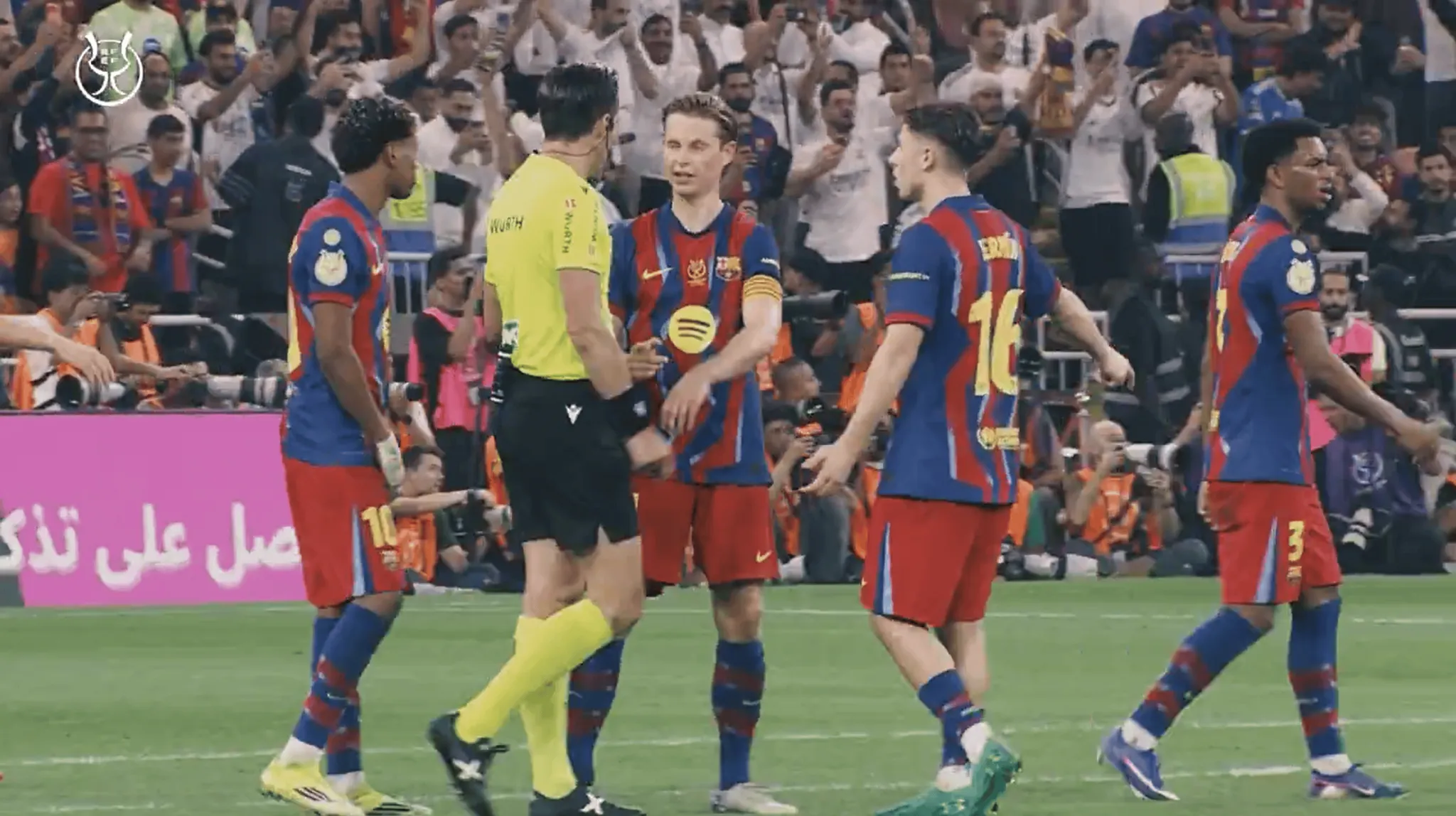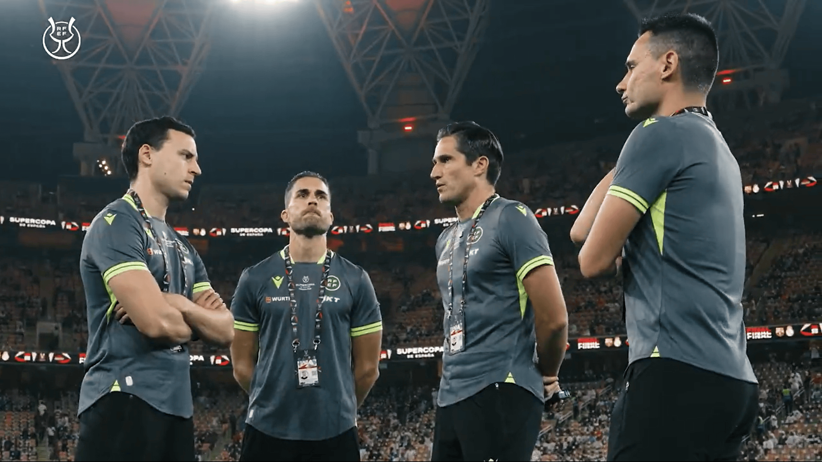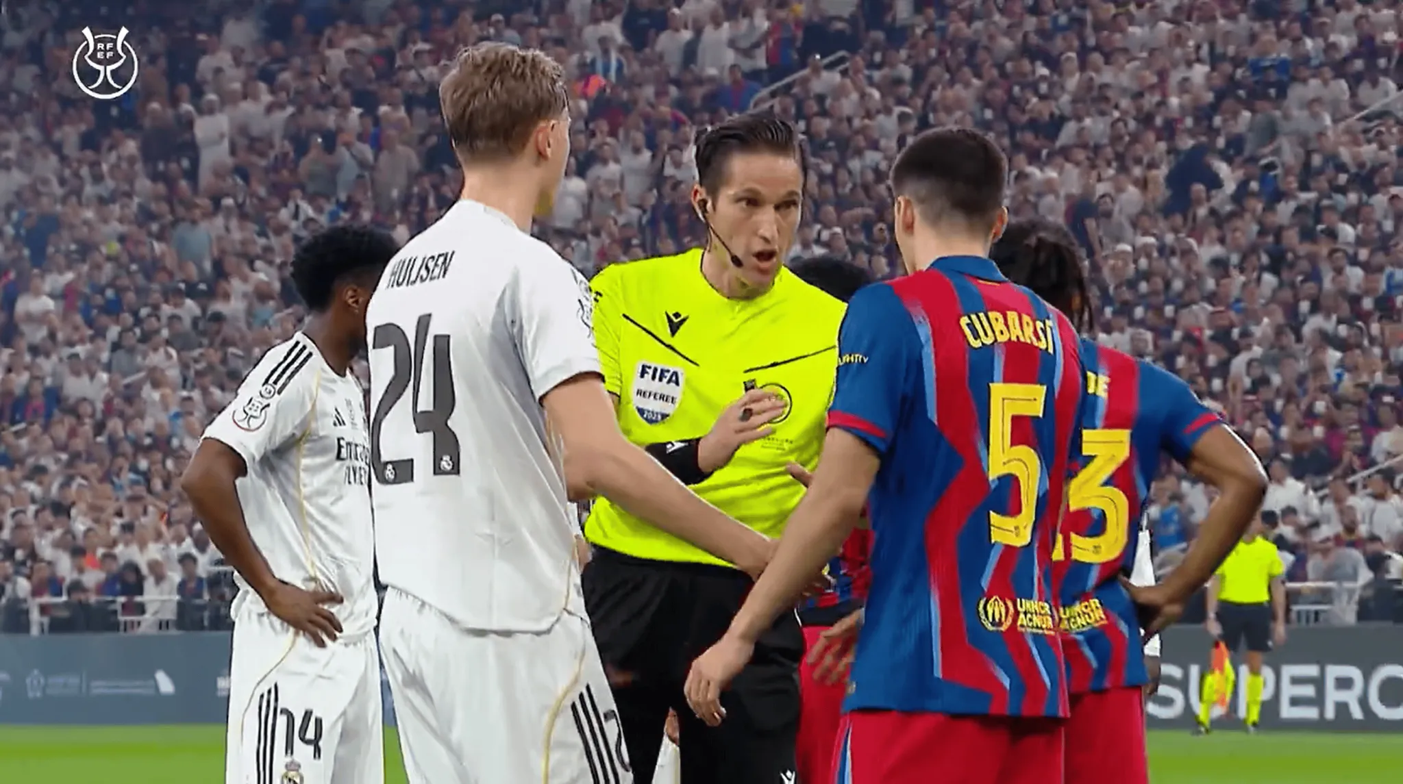 虎撲01月13日訊 西班牙足協(xié)在社交媒體上發(fā)布了西班牙超級杯決賽巴塞羅那對陣皇家馬德里的裁判組錄音,披露了多次判罰背后的現(xiàn)場溝通細(xì)節(jié)。這段名為《穆努埃拉-蒙特羅:決賽錄音》的視頻時長5分23秒,通過主裁判的現(xiàn)場語音串聯(lián)起賽前準(zhǔn)備與比賽過程中的關(guān)鍵節(jié)點。盡管穆努埃拉在賽前希望比賽“沒有爭議”,但實際過程中,雙方球員仍對多次判罰表達(dá)不滿。