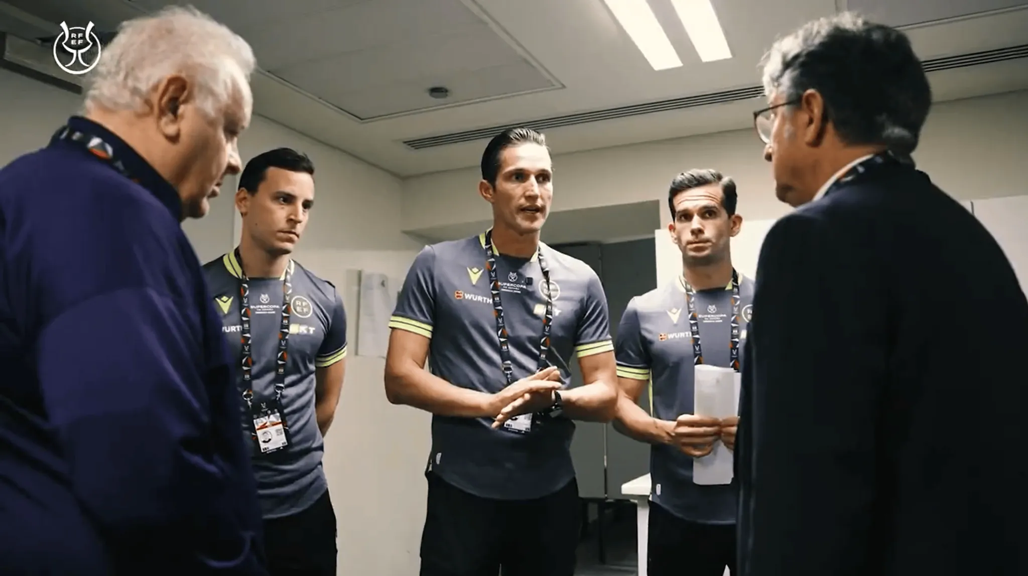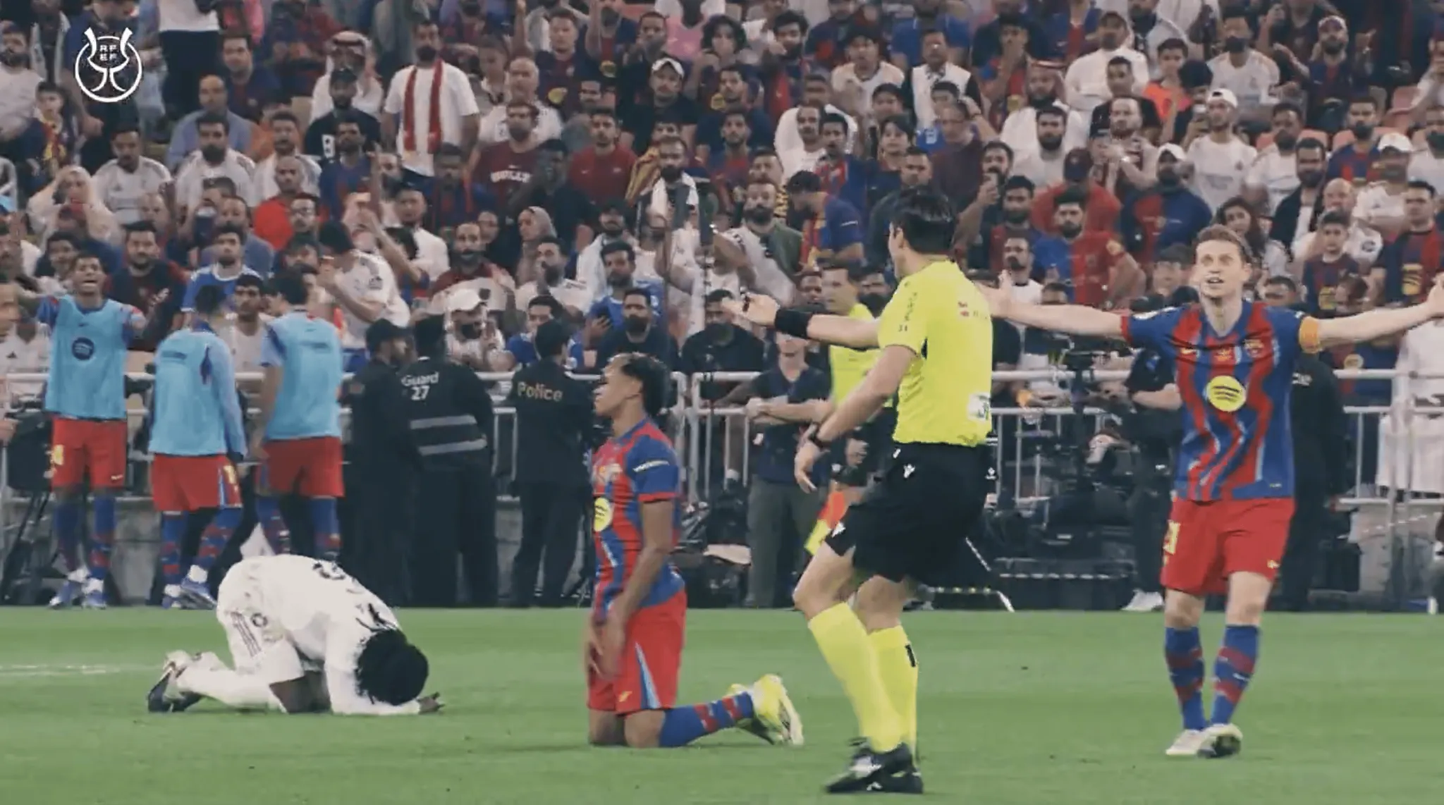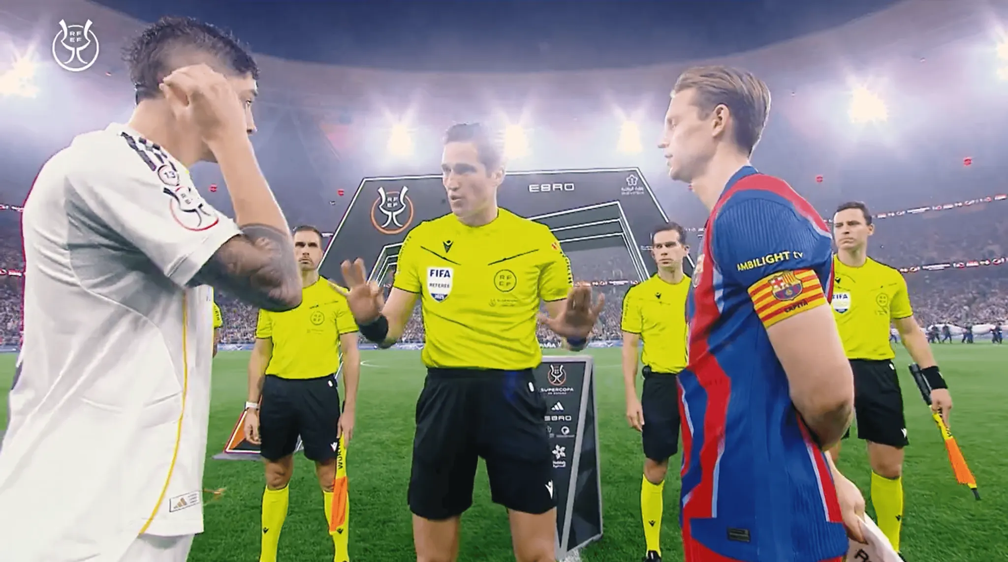 接下來,視頻展示了比賽開始前,穆努埃拉在中圈對巴薩和皇馬兩位隊長德容與巴爾韋德所作的說明:“只要你們是一個一個過來、并且?guī)е鹬?,你們想問什么我都可以解釋;如果一起來就不行了,這點要注意。祝你們好運,伙計們!”隨后他高喊一聲“開始吧!”,示意比賽正式開球。
