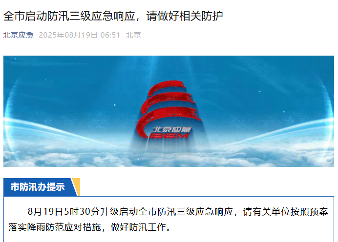 新京報訊 據(jù)北京應(yīng)急微信公眾號消息,北京報北京市防汛辦提示:8月19日5時30分升級啟動全市防汛三級應(yīng)急響應(yīng),全市啟動請有關(guān)單位按照預(yù)案落實降雨防范應(yīng)對措施,防汛防護做好防汛工作。應(yīng)急響