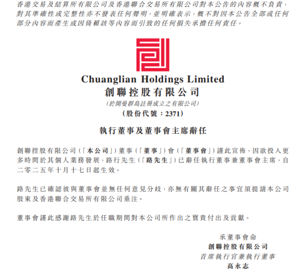 10月17日,創(chuàng)聯(lián)控股有限公司(創(chuàng)聯(lián)控股,02371.HK)公告執(zhí)行董事及董事會(huì)主席辭任。公告稱,路行因欲投入更多時(shí)間于其個(gè)人業(yè)務(wù)發(fā)展,已辭任創(chuàng)聯(lián)控股有限公司執(zhí)行董事兼董事會(huì)主席,辭任自2025年10月17日起生效。