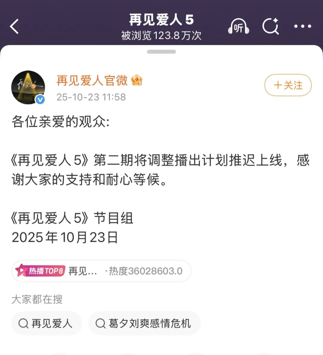 2025年10月23日,鄧莎芒果超媒旗下綜藝《再見愛人5》發(fā)文稱,丈夫丈第二期將調(diào)整播出計(jì)劃推遲上線。即日見愛近千