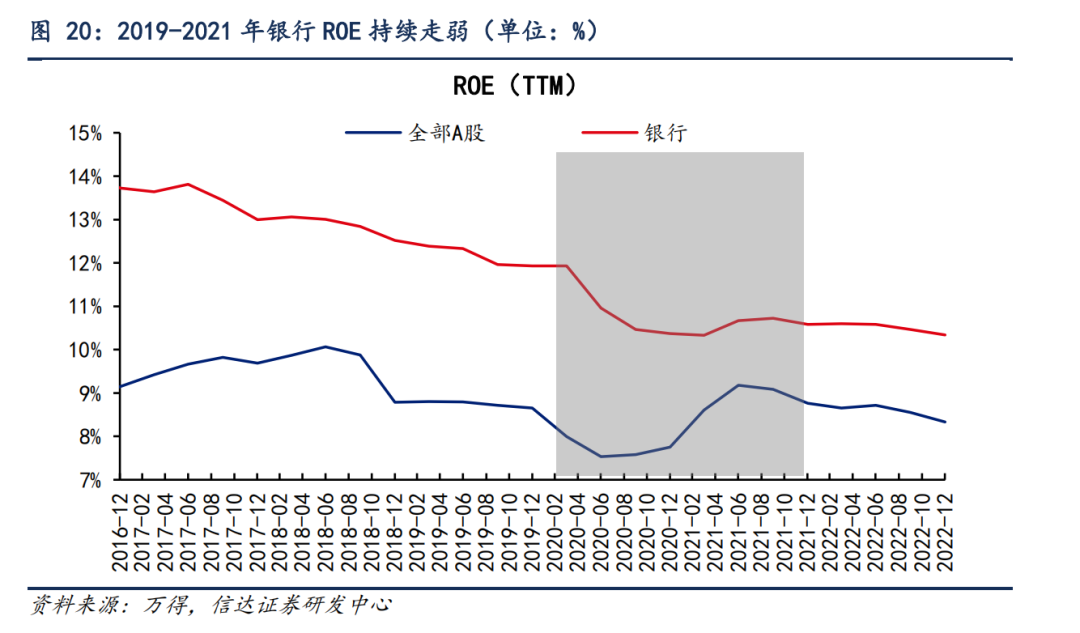 從基本面來看,2019-2021年牛市中銀行板塊業(yè)績兌現(xiàn)較弱。2019-2021年銀行板塊盈利受到以下幾方面影響:經(jīng)濟增速放緩,房企融資政策收緊帶來資產(chǎn)質(zhì)量下降,疫情影響下政策性讓利,貸款利率下行背景下凈息差處于低位等,銀行ROE延續(xù)下行趨勢,從12%下降到10.7%。