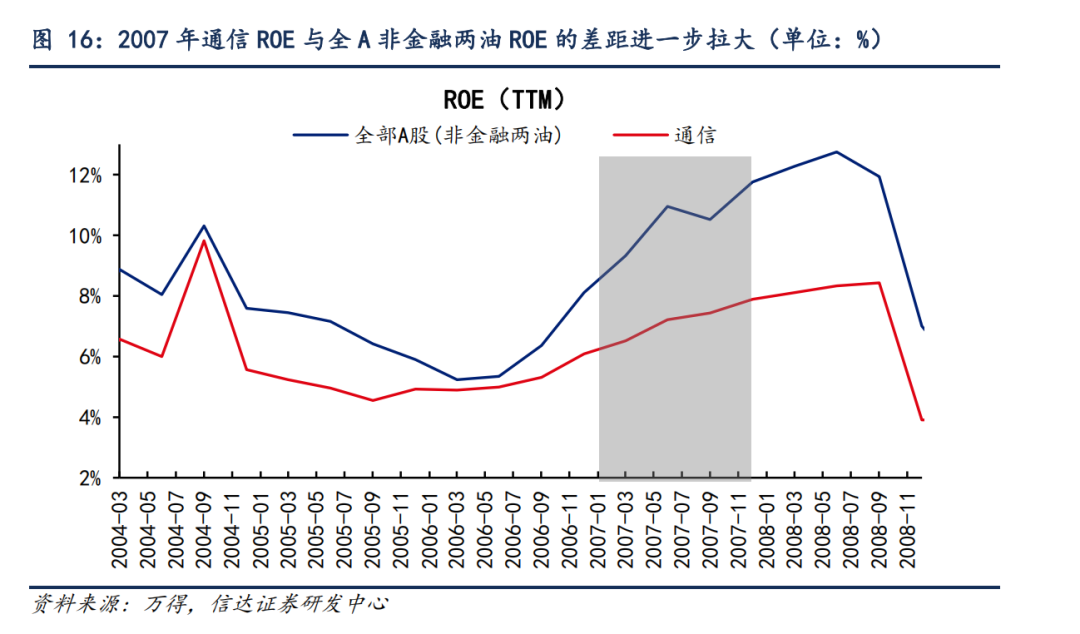 從基本面來看,2007年通信板塊ROE與全A(非金融兩油)ROE的差距進一步加大。2005-2007年的牛市中,通信板塊業(yè)績兌現(xiàn)偏弱,ROE始終低于全A(非金融兩油)的ROE水平。2007年伴隨著經(jīng)濟復蘇,全A(非金融兩油)盈利明顯回升,但通信板塊盈利回升速度相對偏慢,可能受到固定電話用戶減少、資費改革、3G牌照發(fā)放節(jié)奏和投資不及預期、監(jiān)管收緊導致電信增值服務收入下滑等因素的影響。