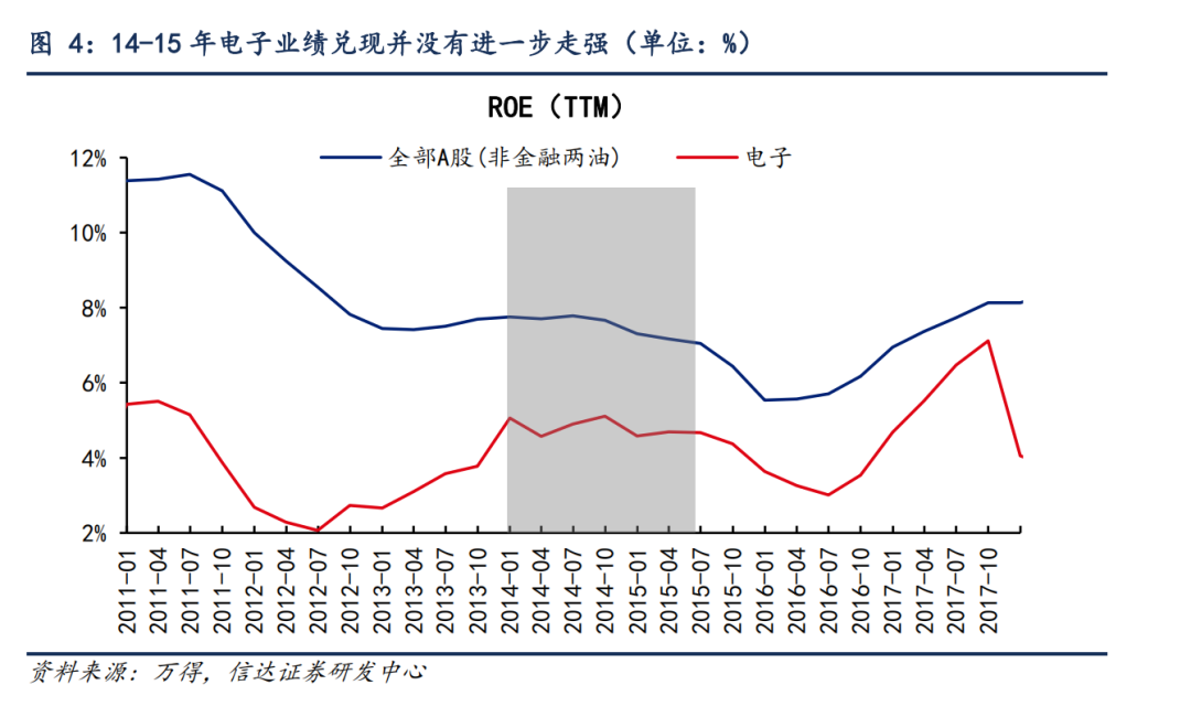 從基本面來看,14-15年電子行業(yè)業(yè)績兌現(xiàn)并沒有進一步走強。13-15年牛市中電子行業(yè)受益于產(chǎn)業(yè)政策支持、4G建設、消費電子需求擴張、并購重組等因素,雖然超額收益不及TMT,但表現(xiàn)也居于前列。但與TMT板塊類似,電子行業(yè)業(yè)績兌現(xiàn)在14-15年并沒有進一步走強,14-15年ROE大多時間在5%左右震蕩,低于全部A股(非金融兩油)的ROE水平。不過考慮到2015年上半年牛市后期電子在盈利震蕩背景下仍然取得顯著的超額收益,我們認為電子在2014年Q4的下跌和基本面變化關(guān)系不大。但可以說明的是,在業(yè)績兌現(xiàn)不強的牛市中,即使是牛市主線波動也會比較大。