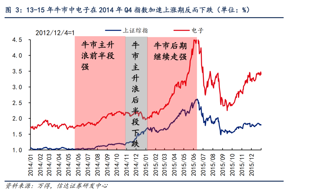 牛市加速期反而下跌的牛市案例:2014年Q4的電子,牛市后期繼續(xù)走強